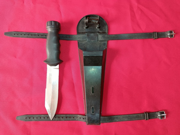 • ANTIGA FACA DE MERGULHO TRAMONTINA. BAINHA EM PLÁSTICO. TAMANHO TOTAL COM BAINHA 31 CM. LÂMINA MEDE 14 CM.