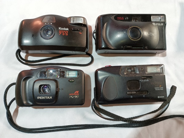 • Lote contendo quatro antigas câmeras fotográficas. Kodak Star 735, Fuji DL-25N, Pentax PC-50 e Yashica YK-35. Para conserto ou retirada de peças.