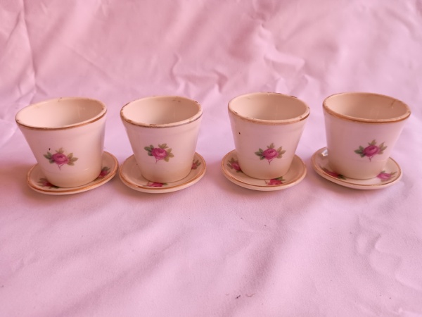• LOTE CONTENDO QUATRO ANTIGOS VASINHOS PARA PLANTAS COM MOTIVOS FLORAIS. ACOMPANHAM SEUS RESPECTIVOS PRATINHOS. ALTURA DOS VASINHOS 4,5 CM. DIÂMETRO DOS PRATINHOS 5,5 CM.