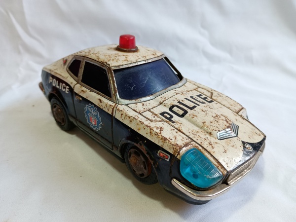 • ANTIGO BRINQUEDO. CARRO DE POLÍCIA EM LATA, FABRICAÇÃO JAPONESA. MEDE APROXIMADAMENTE 9 X 19 CM.