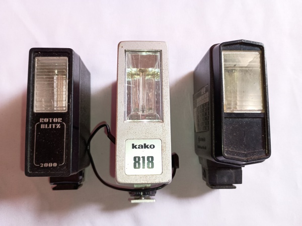 • LOTE CONTENDO TRÊS ANTIGOS FLASHES. ROTOR BLITZ 2000, KAKO 818 E  FRATA. SEM GARANTIA DE FUNCIONAMENTO.