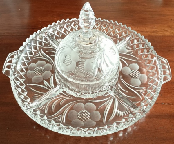 • PETISQUEIRA EM VIDRO DECORADO COM MOTIVO FLORAL. MEDIDAS APROXIMADAS: 2,6 KG E 15 X 30 X 33 CM.