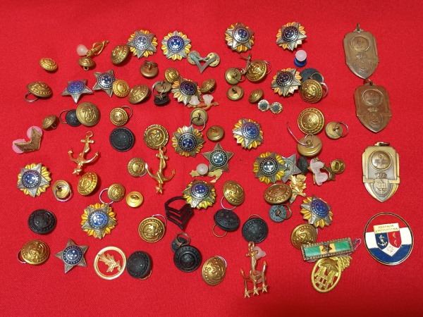 • LOTE CONTENDO 90 ITENS ENTRE ELES ANTIGOS BOTÕES E PINS MILITARES.