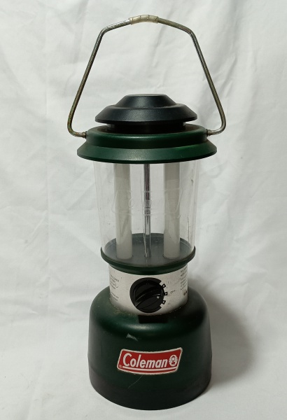 • LAMPEÃO DA MARCA COLEMAN, A PILHA. CORPO DE PLÁSTICO. POSSUI UM TRINCADO, COMO MOSTRA IMAGEM. APROXIMADAMENTE 28 CM DE ALTURA.