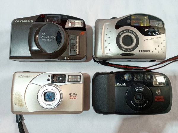 • Lote contendo quatro antigas câmeras fotográficas.  Olympus Accura zoom XB70, Tron Big View BV-Metal, Canon Prima BF 800 e Kodak Star 1035Z. Para conserto ou retirada de peças.