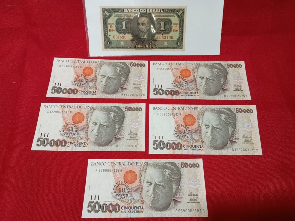 • LOTE CONTENDO 6 CÉDULAS ANTIGAS. SENDO UMA CÉDULA DE UM MIL RÉIS E CINCO CÉDULAS DE CINQUENTA MIL CRUZEIROS.