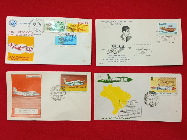 • LOTE CONTENDO QUATRO ANTIGOS ENVELOPES. SÉRIE CENTENÁRIO DE SANTOS DUMONT, AVIÃO BANDEIRANTE, HOMENAGEM À AVIAÇÃO CIVIL RAID JAHU E PRIMEIRO VOO DO XAVANTE.