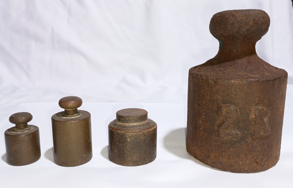 • LOTE CONTENDO QUATRO PESOS EM BRONZE. PESAM SEPARADAMENTE 100 GRAMAS, 200 GRAMAS, 238 GRAMAS E 2 KG.